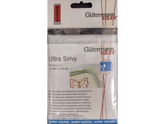 SULKY ULTRA SOLVY är en extra stark och transparent, vattenlöslig film som tvättas ur med varmt vatten efter bearbetning. SULKY ULTRA SOLVY kan klämmas fast i broderibågen och broderas direkt, utan tyg eller extra fleeceförstärkning.